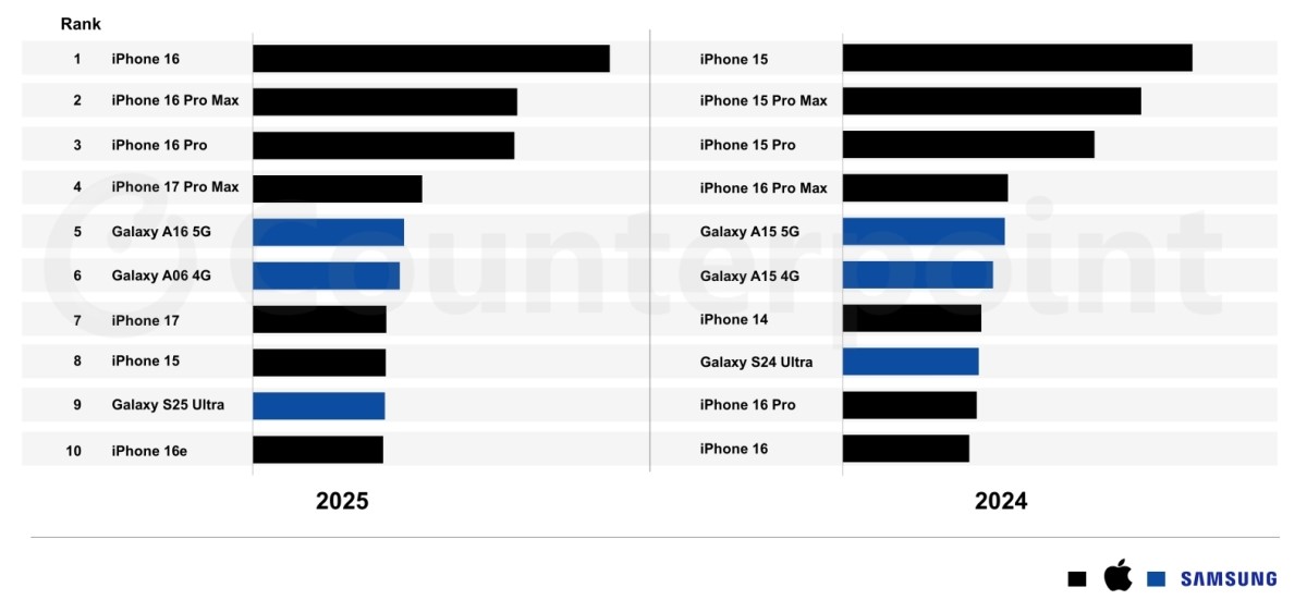 A jelentés kiemeli az Apple tavalyi évben elért sikereit. Ezzel kapcsolatban nem kizárólagosan a magabiztosan nyerő iPhone 16-ot illeti a képletes vállveregetés, hanem a tavaly szeptemberben debütált 17-es szériát is, amely az első teljes negyedévében 16 százalékkal jobb forgalmi adatokat produkált elődjénél. Mindez meg is látszik a helyezésen, hiszen a 17-es generáció alapmodellje a 2025-ös listán a 7. helyre futott be, míg egy évvel korábban az alapkiszerelésű 16-nak be kellett érni az utolsó, 10. pozícióval.